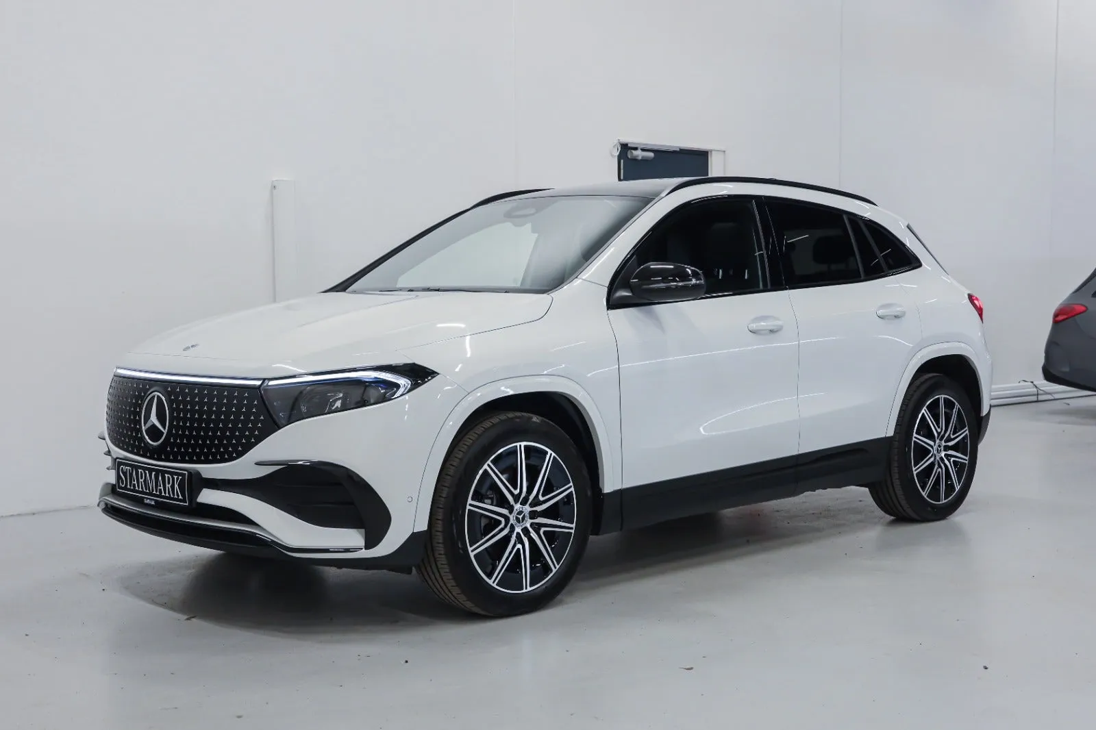 Design: Digitalhvid metallak, AMG Designlinje, Nightpakke, 19" AMG letmetalfælge i 5-dobbelt eget design, ARTICO kunstlæder/MICROCUT mikrofiber sort, Taghimmel sort, Fladbundet multifunktionssportsrat i nappalæder, AMG bundmåtter, Interiørliste med stjernemønster belyst, Interiørlister med belysning, Varmeisolerende og mørktonede ruder, Ambiente belysning (64 farver), Tagræling i sort, Belyste trinlister med logo, Sikkerhed/miljø: Fodgængerbeskyttelse, ISOFIX, Dæktryksovervågning, Knæairbag, Akustik advarsel, TIREFIT, Bagsædeseleindikator, Ladekabel (5 meter) til wallbox og offentlig ladning.
