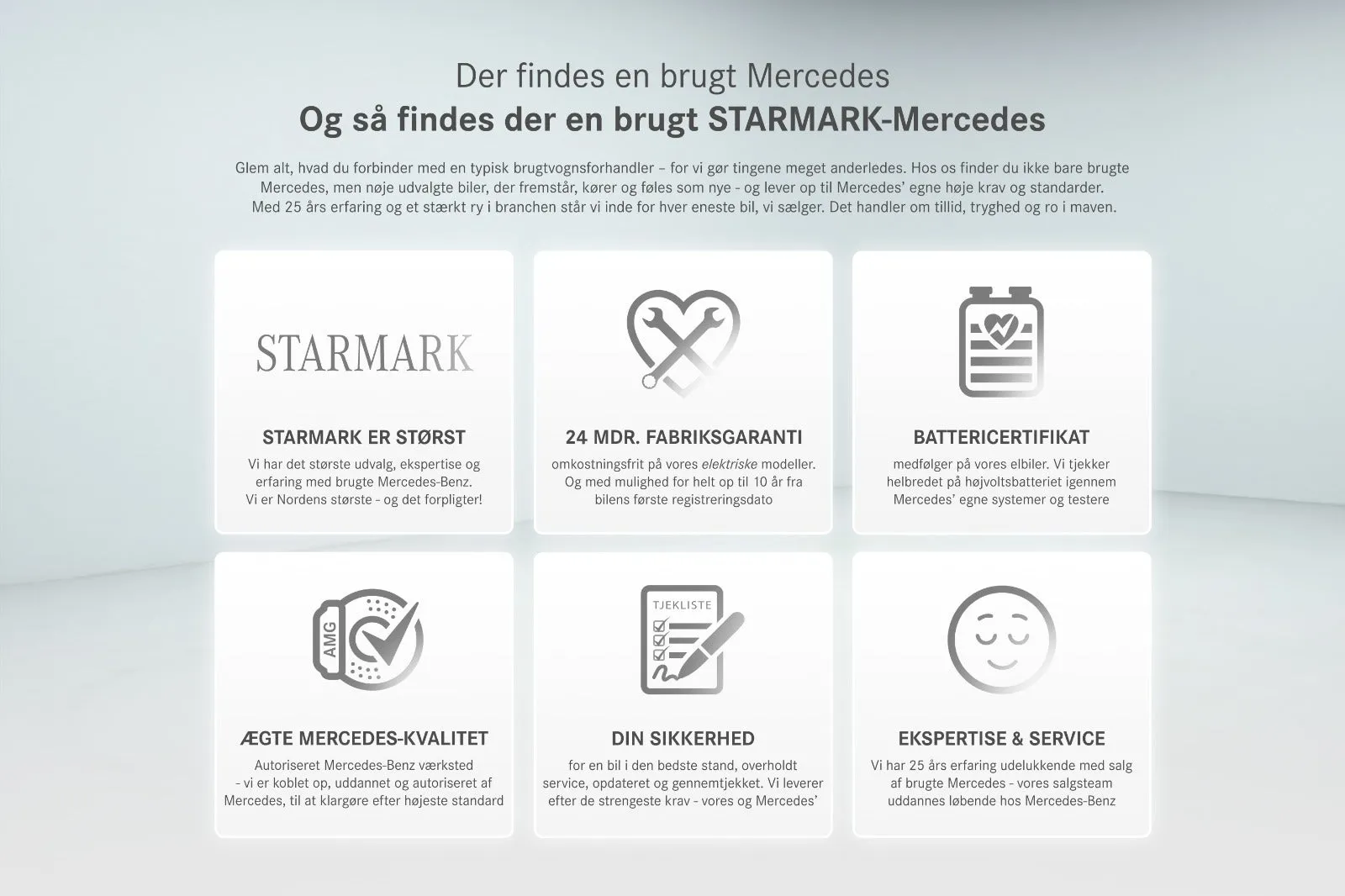 Starmark er Danmarks største forhandler af brugte Mercedes-Benz med mere end 20 års erfaring. Vi er autoriseret Mercedes-Benz værksted og alle biler er klargjort efter højeste standard.