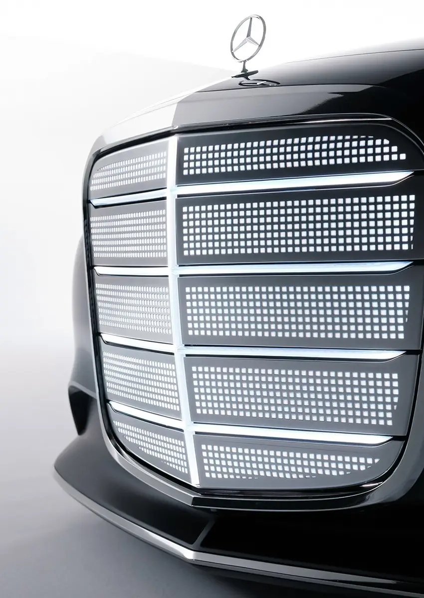 Kølergrillen på VISION ICONIC er stærkt inspireret af tidligere Mercedes generationer fra 30'erne og 70'erne. Den store og bastante grill er et tydeligt nik til den klassiske kromgrill, som har været en del af Mercedes’ udtryk i over 100 år nu - og naturligvis kombineret med den oprejste Mercedes-stjerne ovenover. Formen trækker tråde til klassikere som W108, W111 og den legendariske 600 Pullman.
