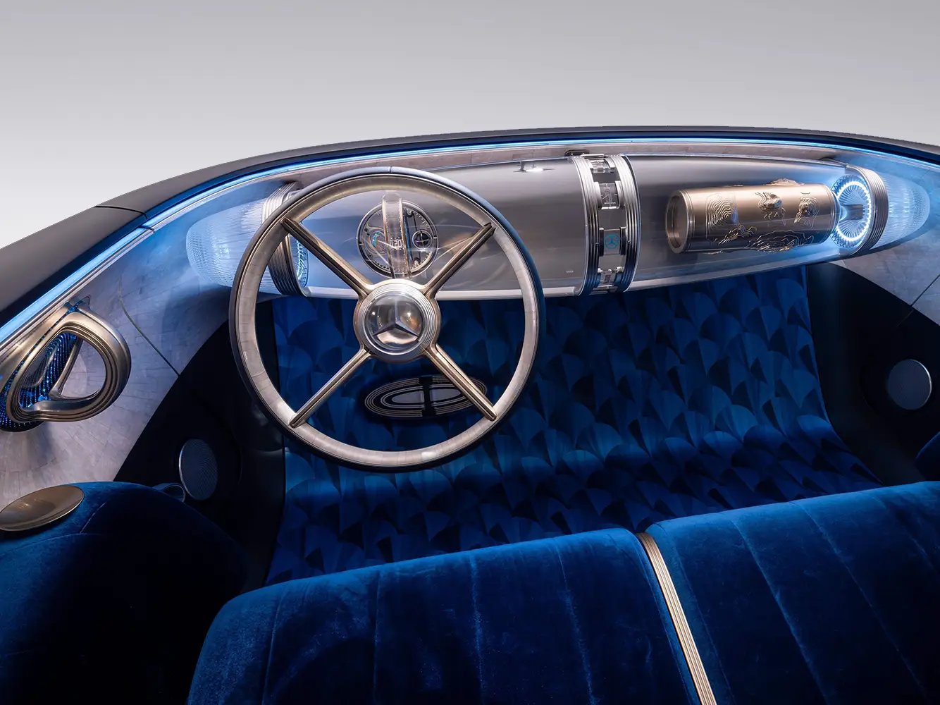 I kabinen mødes Art Deco-håndværk med moderne teknologi i et loungeagtigt rum fyldt med ro (det simple layout og de få elementer) og detaljer. Midt i det hele "svæver" den skulpturelle Zeppelin, hvor analoge urværksbevægelser og digitale displays smelter sammen. Perlemor, messing og dybblåt velour skaber et enormt eksklusivt udtryk, mens stjernen i rattet nærmest flyder som et smykke.